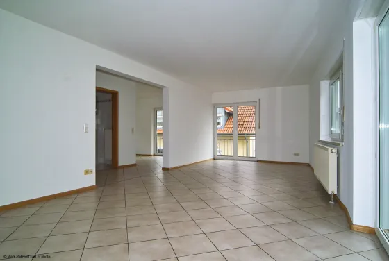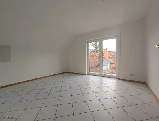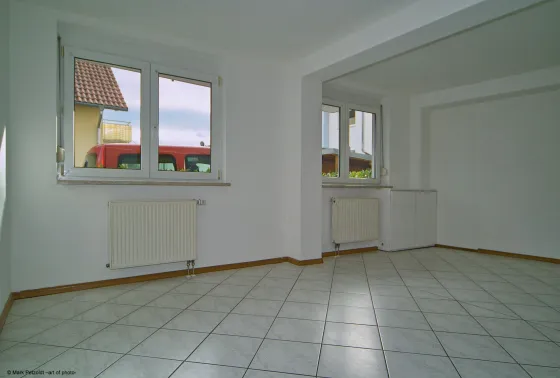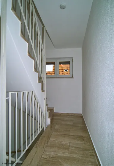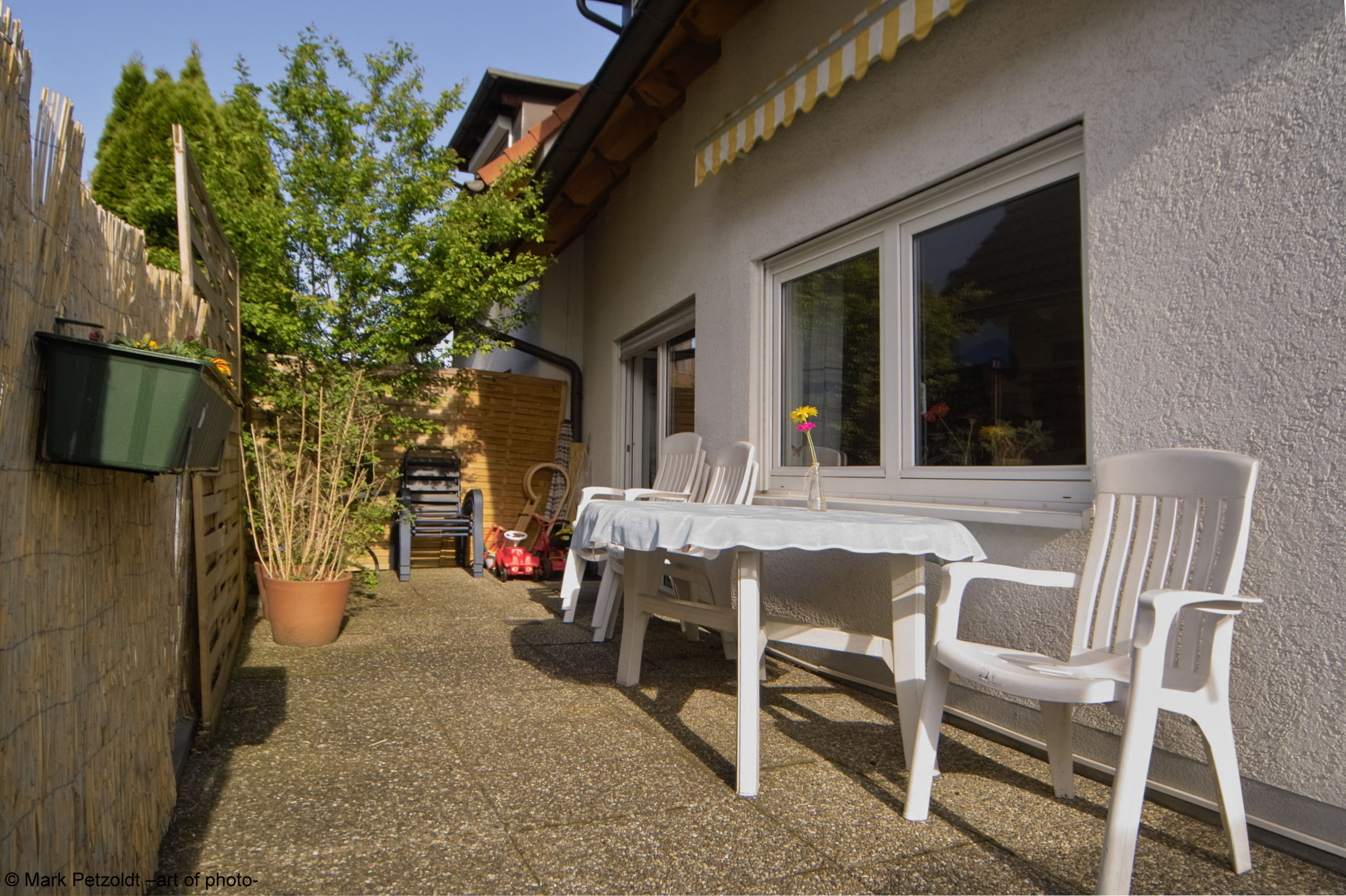 Im Obergeschoss befindet sich die halboffene Küche, der Wohn-/Essraum, Tageslichtbad mit Wanne und Dusche (hier können auch Waschmaschine und Trockner aufgestellt werden), Gäste-WC, ein Balkon und eine Balkonterrasse mit ca. 35 m² Fläche (keine Gartenfläche vorhanden).