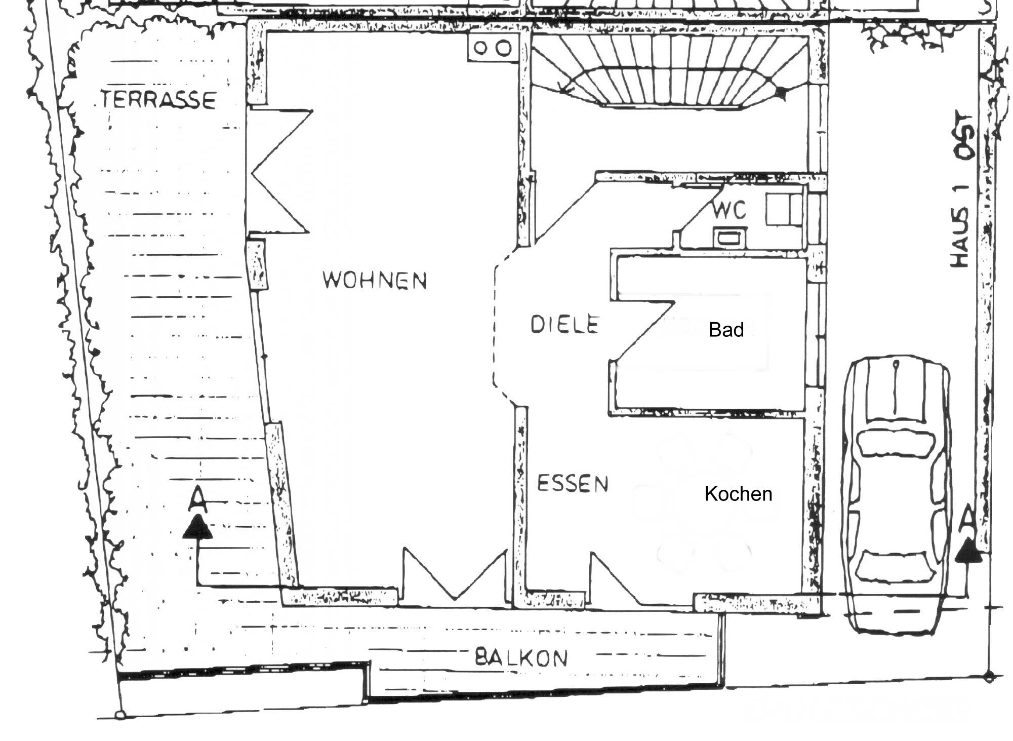 Direkt neben dem Eingang befindet sich der dem Haus zugeordnete Kfz-Stellplatz.
