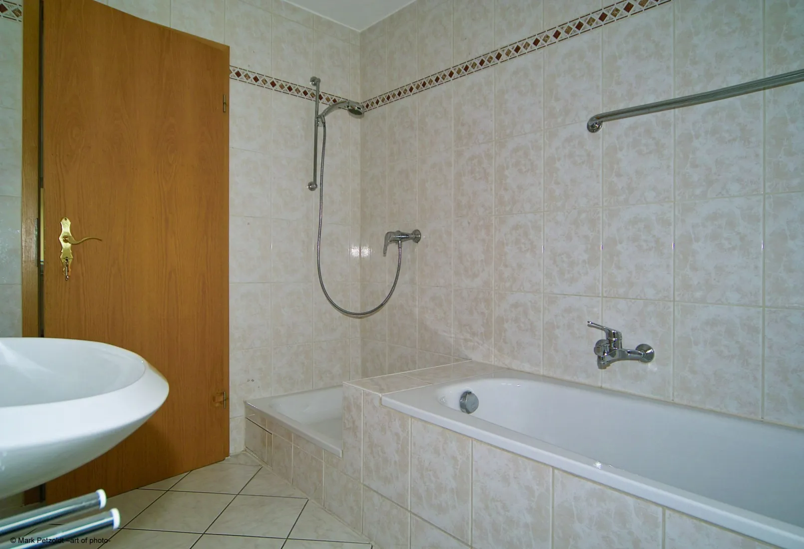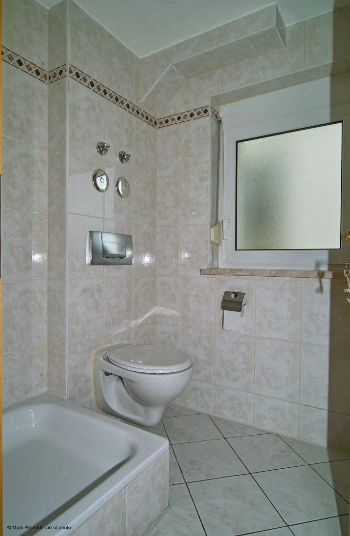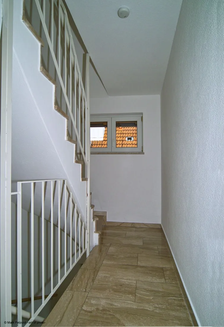 Das gesamte Haus ist hell und pflegeleicht gefliest. Das Treppenhaus ist mit Steinboden (Travertin) ausgestattet. Die Fenster und Balkontüren bestehen aus Kunststoff und haben Rolläden (mit Ausnahme der Dachlegefenster und der Giebelverglasung im DG 2). Die Balkone sind gefliest und die Balkonterrasse ist mit Platten belegt. Auf jeder Etage ist ein Badezimmer mit Dusche bzw. Dusche und Wanne vorhanden. DSL ist derzeit mit bis zu 100 MBit/sverfügbar.